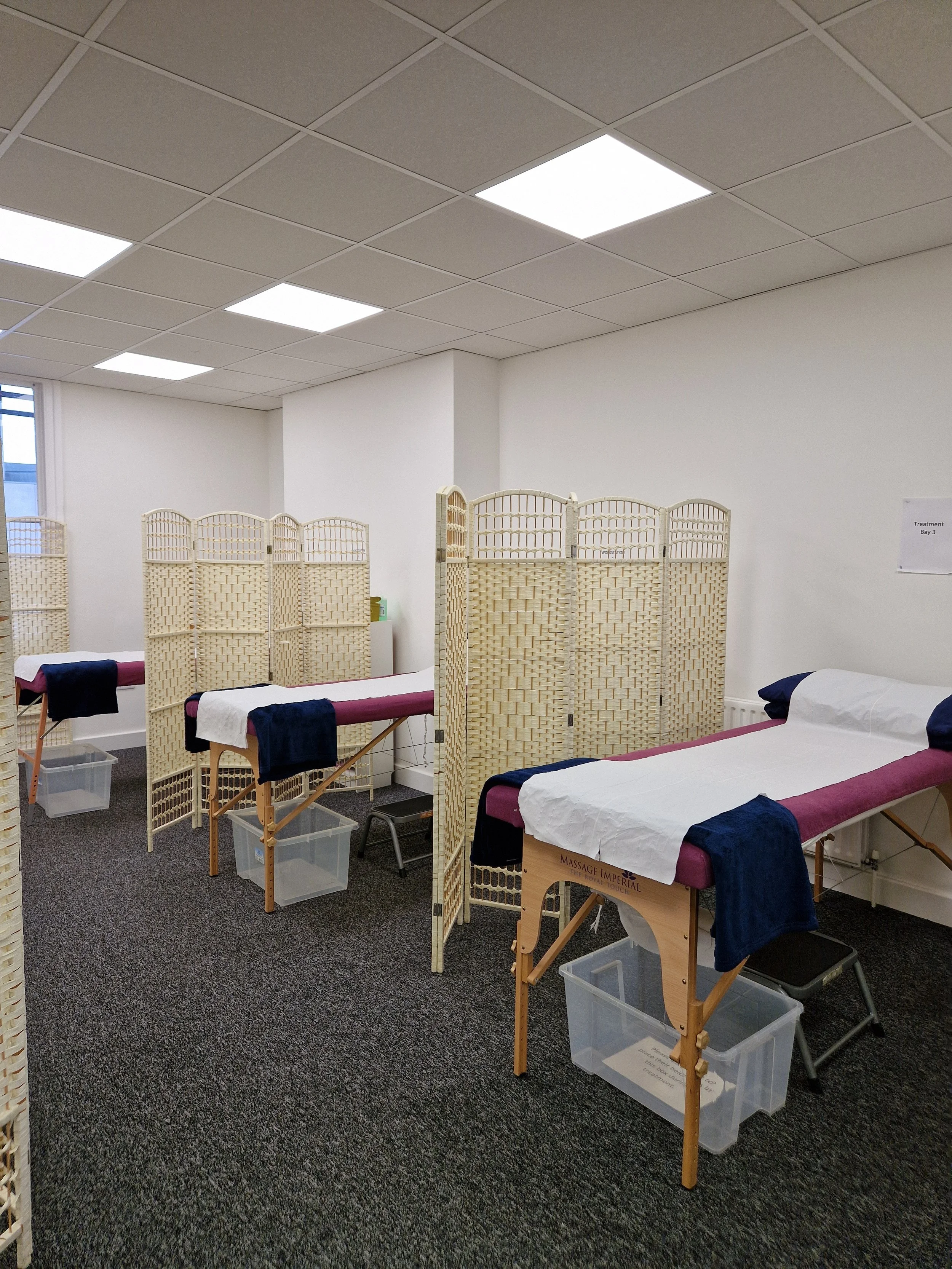 A larger room, shared space with several treatment couches with screen dividers between them.